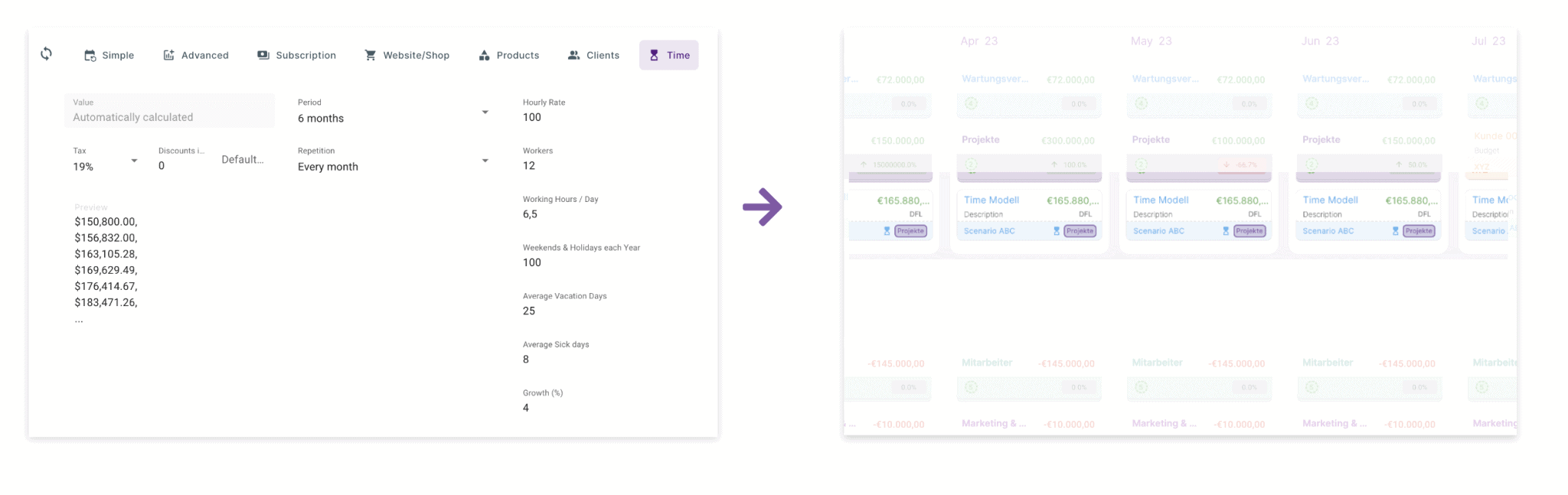 Mit finban, z.B., kannst DU ganz einfach smarte Sequenzen anlegen. Her definierst Du ein Deine SaaS-Parameter, wie ARPA oder Churn-Rate, und erstellst mit einem Klick eine 12- oder 24-monatige Prognose.