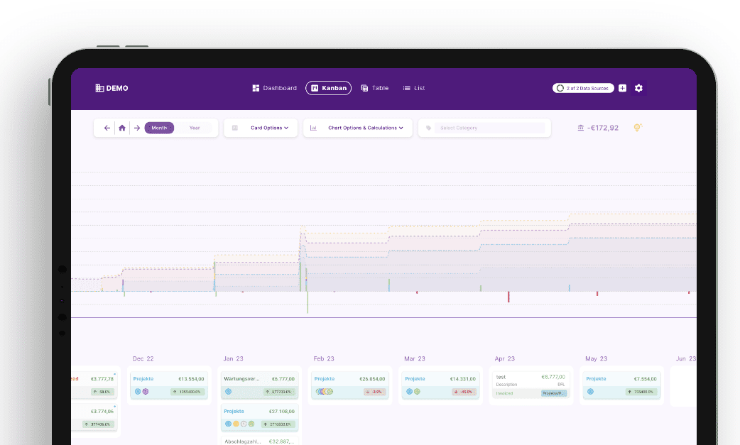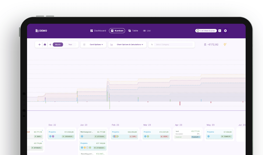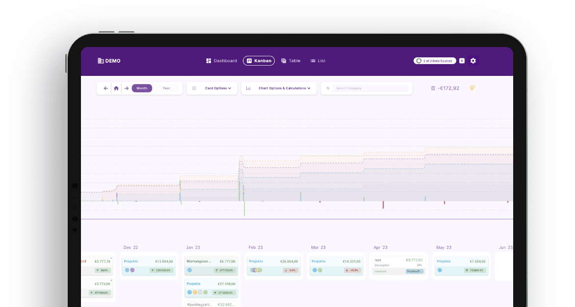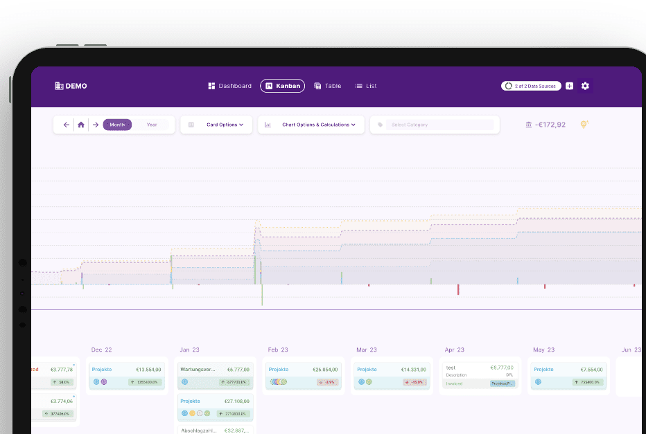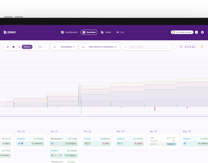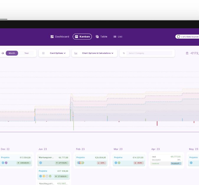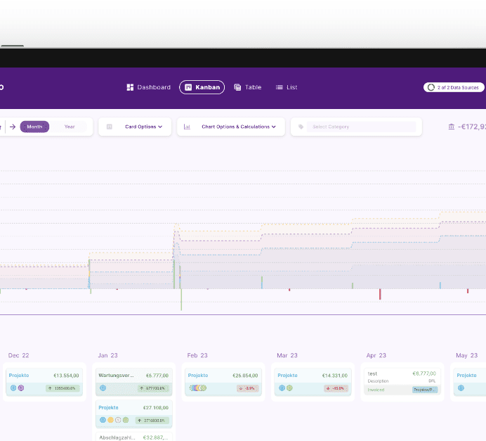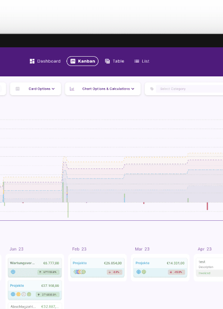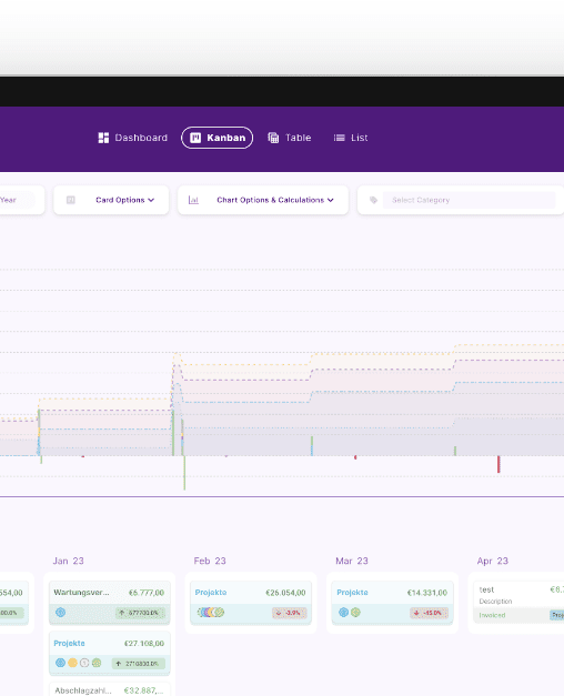 - Überwachung und Prognosen: finban bietet ein umfassendes Finanz-Dashboard, das einen Echtzeit-Einblick in die Unternehmensleistung ermöglicht. Durch die nahtlose Integration von Bankkonten können Einzahlungen und Auszahlungen automatisch erfasst werden, was die Liquiditätsentwicklung transparent macht und manuelle Übertragungen überflüssig werden lässt. finban dient dabei als Controlling Instrument für die Liquiditätsentwicklung und unterstützt so eine effiziente Finanzplanung.