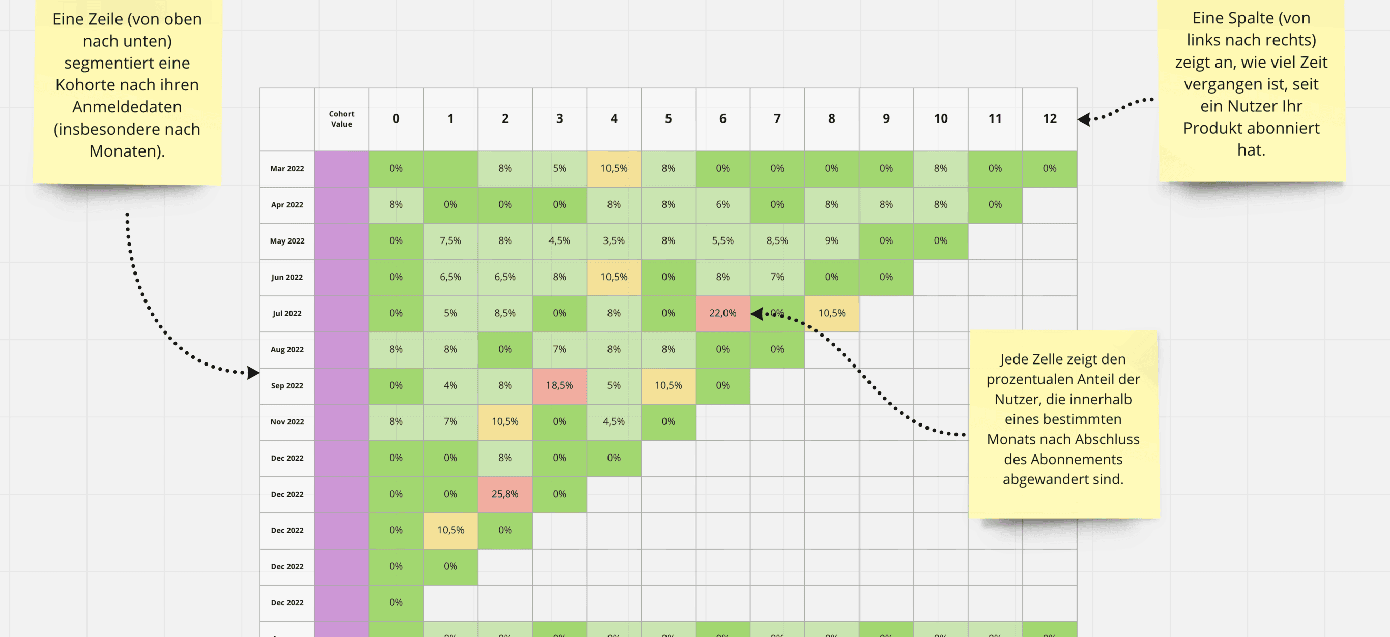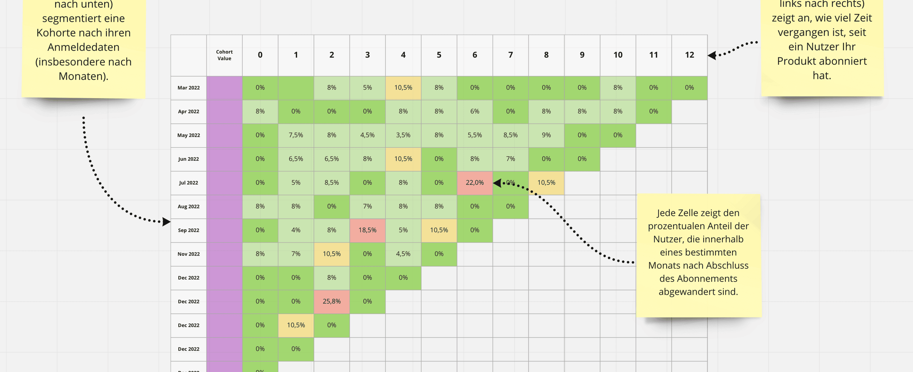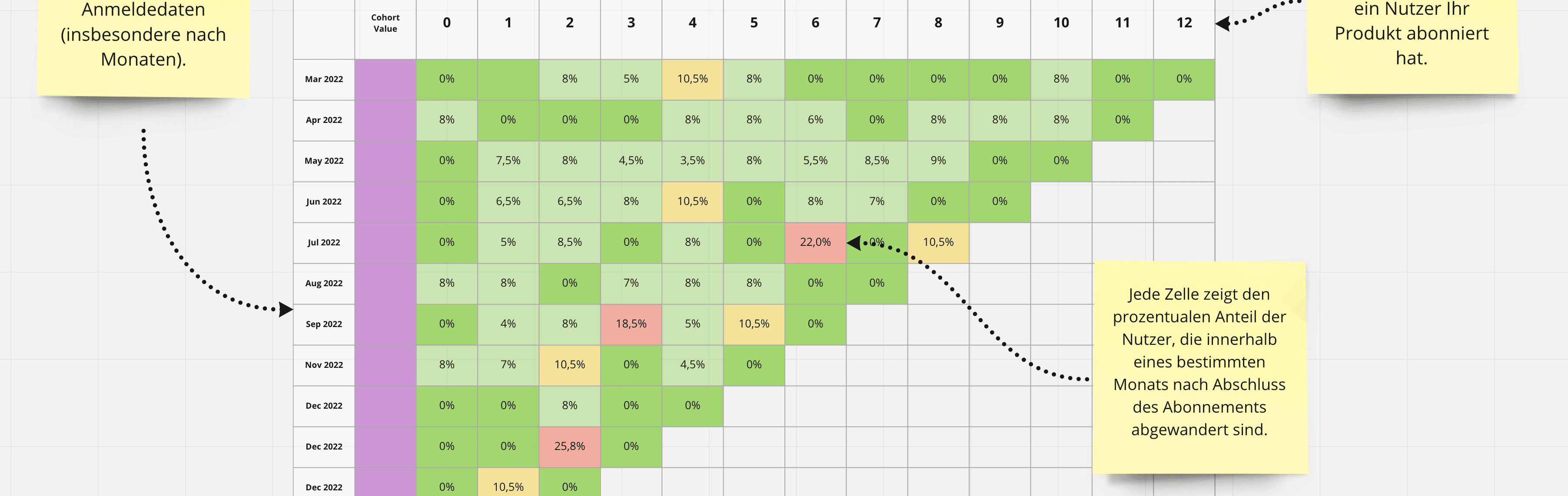Wie lange bleibt ein durchschnittlicher Nutzer bei Ihrem Produkt, und ab welchem Punkt wird er abgewandert? Welches Segment Ihrer Nutzer (z. B. nach Persona, nach Plan usw.) ist am stärksten von Abwanderung betroffen? Die Kohortenanalyse wird mithilfe einer Kohortendatenbank durchgeführt.