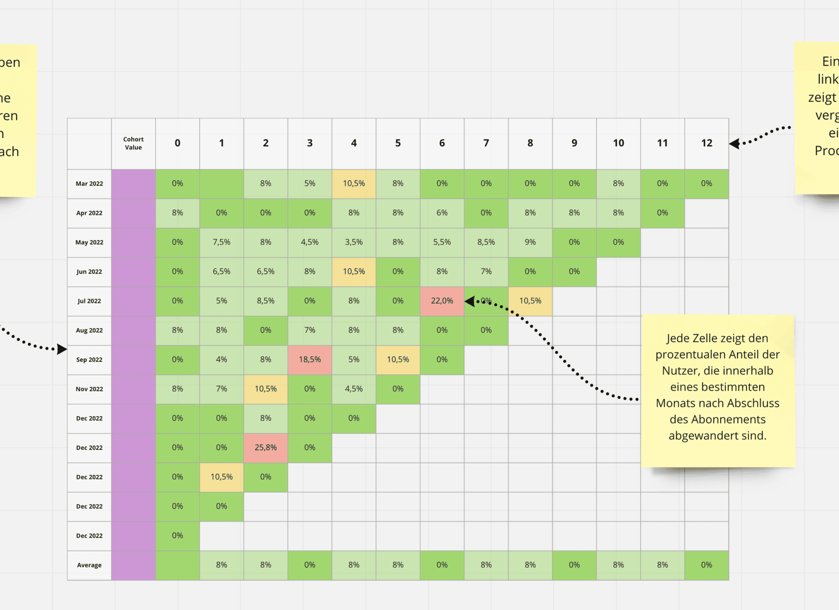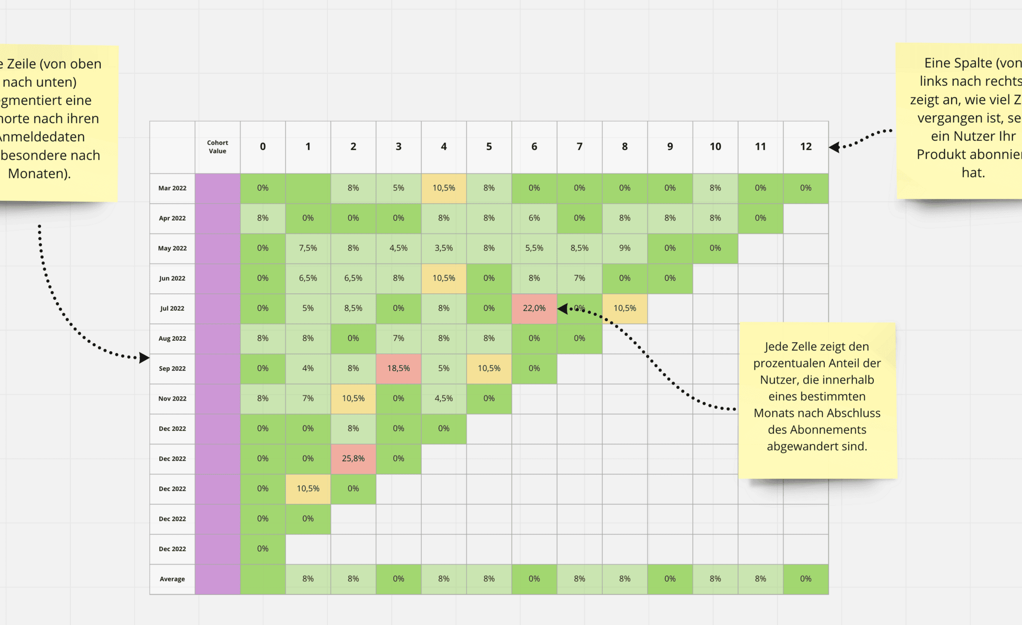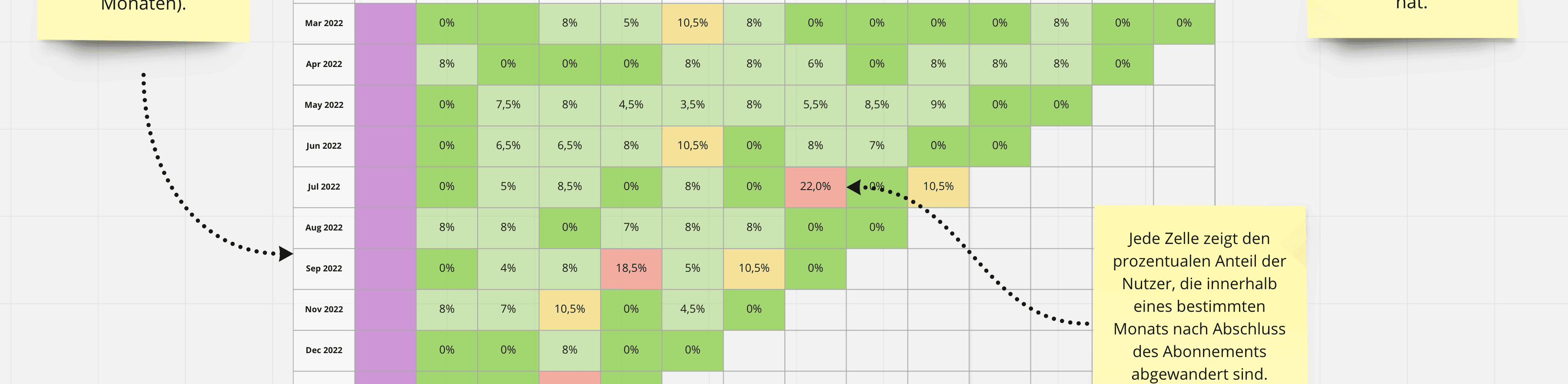 Wie lange bleibt ein durchschnittlicher Nutzer bei Ihrem Produkt, und ab welchem Punkt wird er abgewandert? Welches Segment Ihrer Nutzer (z. B. nach Persona, nach Plan usw.) ist am stärksten von Abwanderung betroffen? Die Kohortenanalyse wird mithilfe einer Kohortendatenbank durchgeführt.