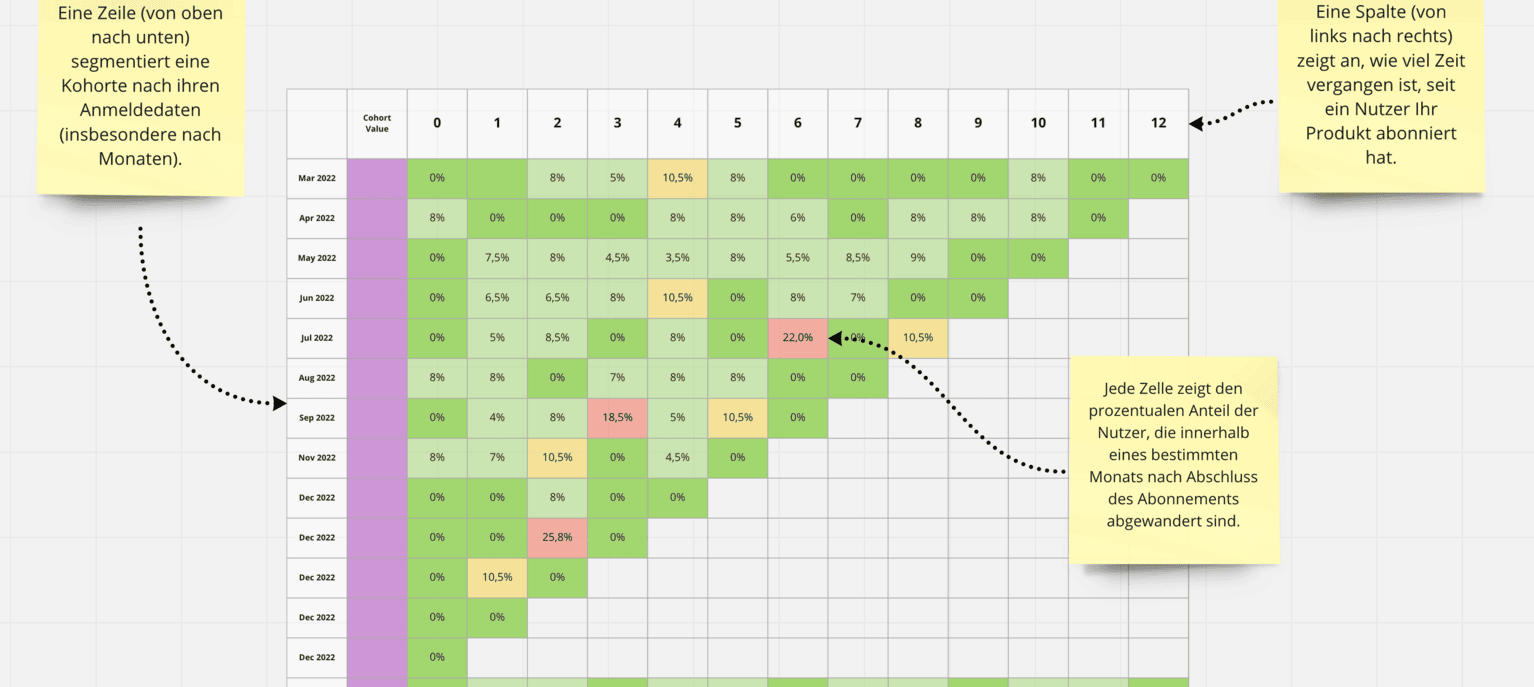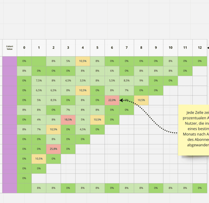 Die Kohortenanalyse ist eine Art der Verhaltensanalyse, mit deren Hilfe Sie sehen können, was ein Teil Ihrer Nutzer (eine “Kohorte”) in Ihrem Tool tut. Die Kennzahl, die Sie in der Regel mit der Kohortenanalyse für SaaS messen, ist die Benutzerabwanderung (Churn)- der Moment, in dem einige Benutzer aufhören, Ihr Produkt zu nutzen und es verlassen. Aus diesem Grund kann man sie auch als “Kundenabwanderungsanalyse” bezeichnen.
