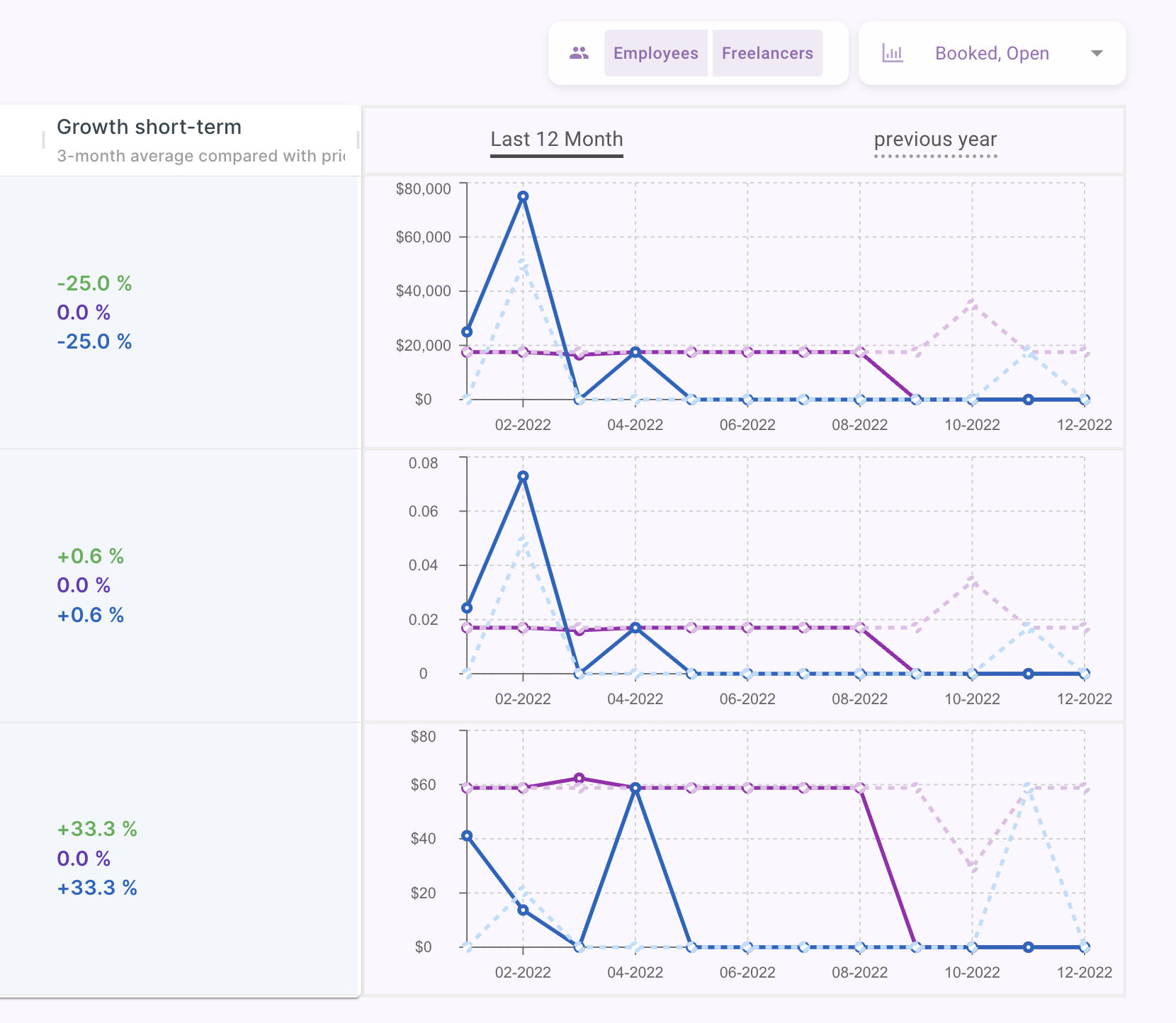 - Wie entwickeln sich Kosten und Wachstum verglichen zu Vorjahres- oder Vormonats-Zeiträumen