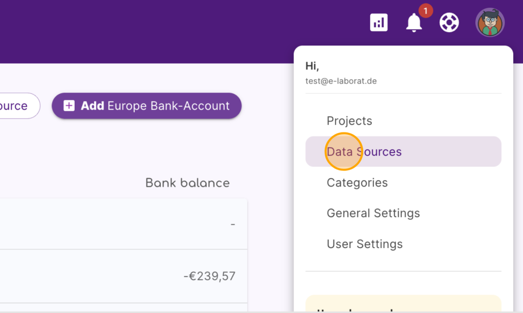 Klicke oben rechts auf Deinen Avatar und wähle Datenquellen (Data Sources)