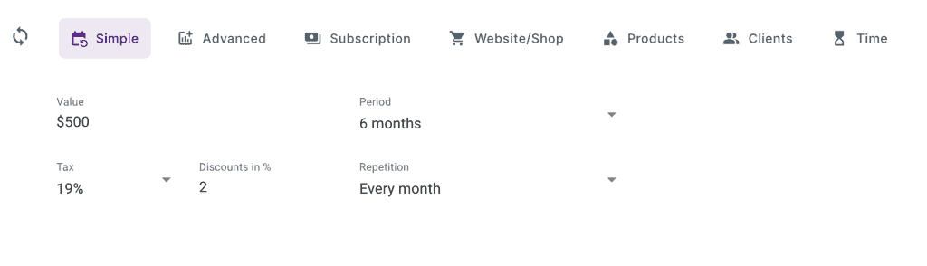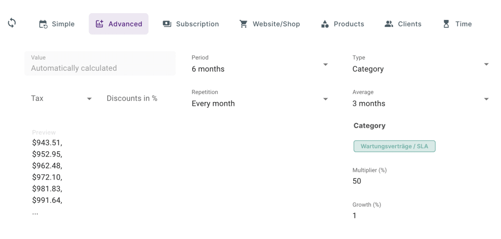 Hier kannst Du einen Multiplikator auf Deinen Umsatz, Deine Ausgaben oder eine Kategorie anlegen. Du kannst auch auswählen, wie der Durchschnitt berechnet wird.