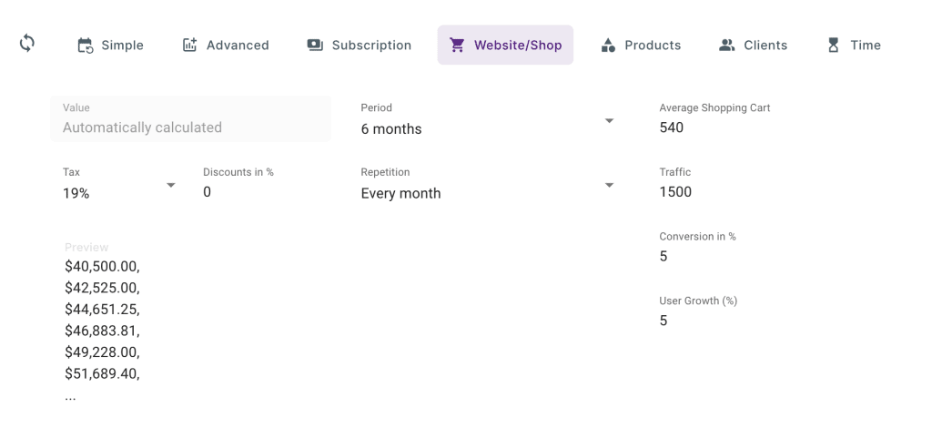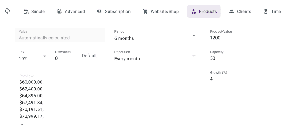 Du verkauft Produkte? Trage ein wie viel Du pro Monat verkaufst und den durchschnittlichen Wert