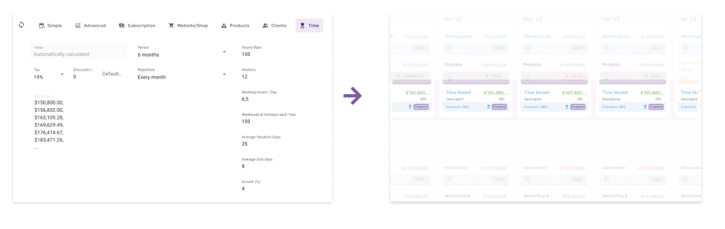 Dein Modell ist Zeit gegen Geld? Trage folgende Werte ein: