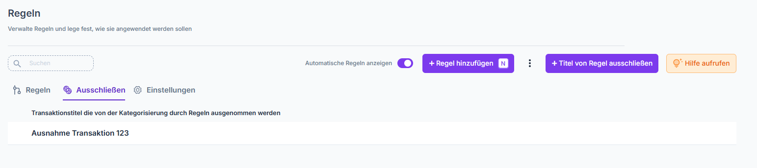 Durch das Hinzufügen von Titeln, kannst du Transaktionen ausschließen, die nicht von Regeln kategorisiert werden sollen.