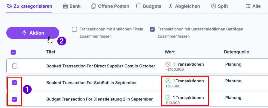 Du kannst auch mehrere Transaktionen, die entweder Einzahlungen sind oder Auszahlungen markieren.