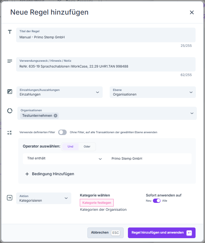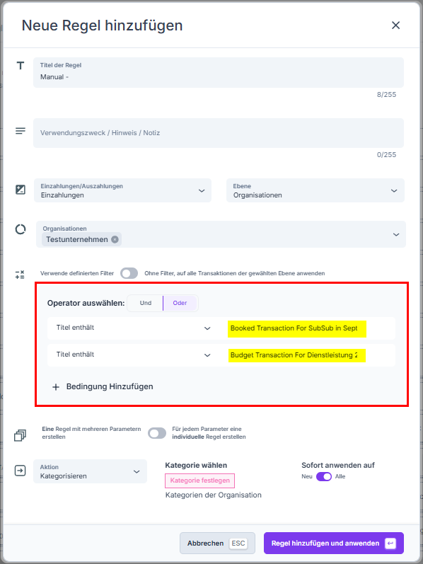 Im Anschluss öffnet sich das Regeln-Erstellen-Fenster. Der Titel der Transaktion, über die du die Regel dabei bist zu erstellen, wird als Bedingung vorgeschlagen.