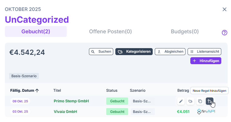 Durch einen Klick auf den entsprechenden Bereich in der Zeile "Unkategorisiert" öffnet sich ein neues Fenster. Wenn du anschließend mit der Maus über die entsprechende Transaktion fährst, kannst du auf Basis der Transaktion eine neue Regel erstellen.