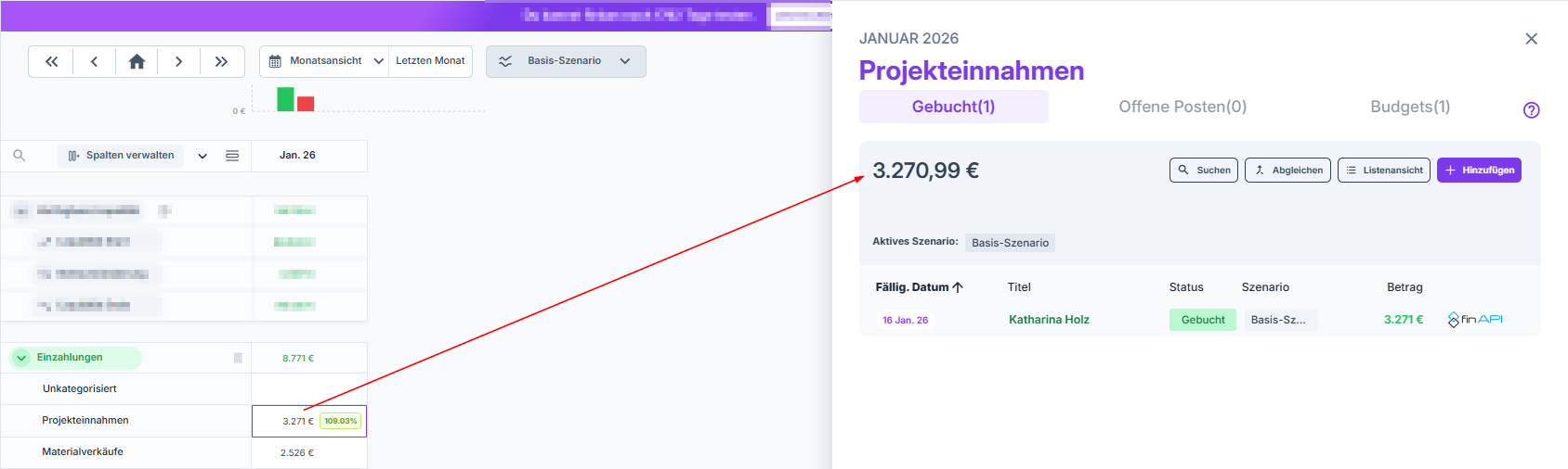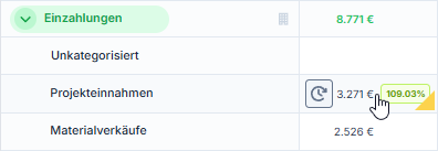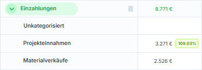 Auf dem nachfolgenden Screenshot siehst du den Eintrag eines vergangenen Monats. Bei diesem Beispiel haben die Banktransaktionen Einzahlungen in Höhe von 3.271 € ausgemacht. Die 109,03 % die grün hervorgehoben sind, stellen dar, wie sich der Ist-Wert (3.271 €) zum Soll-Wert (Budget) verhält. In diesem Fall wurden 9,03 % mehr Einzahlungen generiert als angenommen.