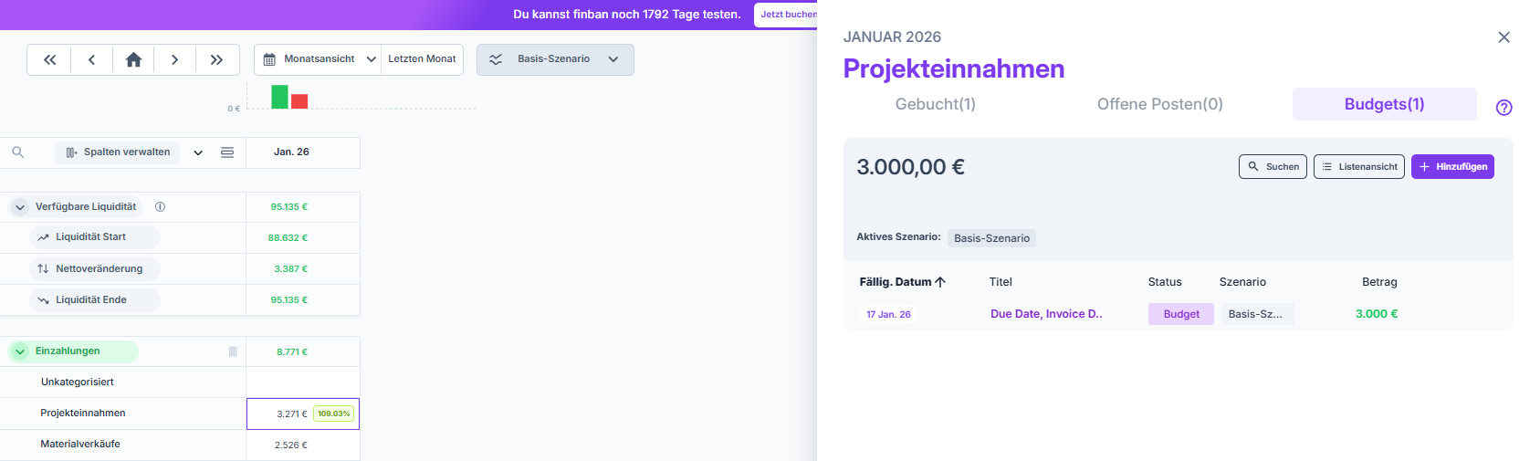 finban berücksichtigt offene Posten so, als würde das Geld im jeweils relevanten Monat bereits zufließen, sodass erwartete Einzahlungen frühzeitig in die Liquiditätsplanung einfließen. Sobald ein offener Posten im Buchhaltungsprogramm als „gebucht“ gekennzeichnet wird, gilt der Zahlungseingang als tatsächlich erfolgt. Ab diesem Zeitpunkt wird der offene Posten in finban nicht mehr separat in der Liquiditätsberechnung berücksichtigt, sondern durch die entsprechende Banktransaktion ersetzt.