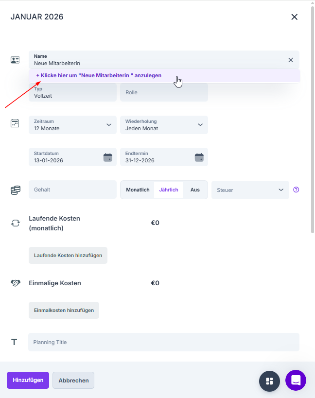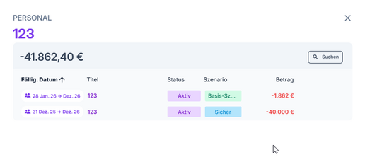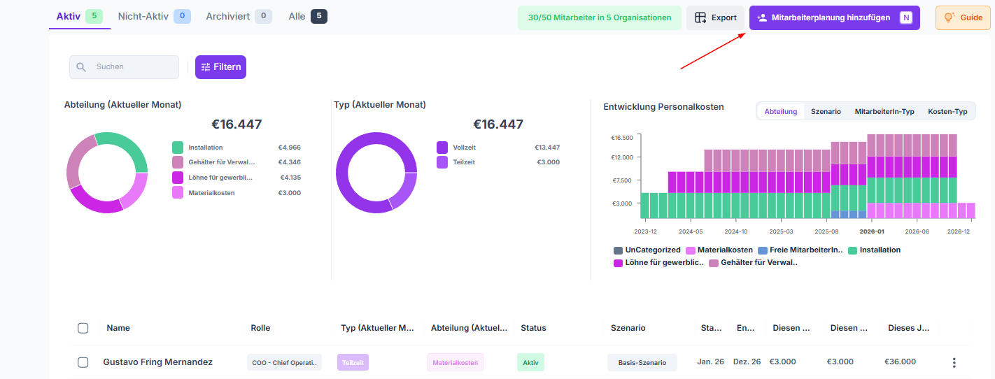Wenn du eine zusätzliche Planung deinem Mitarbeiter hinzufügen willst, z.B. ein neues Gehalt, dann kannst du das in der Hauptübersicht machen, in dem du auf das + gehst