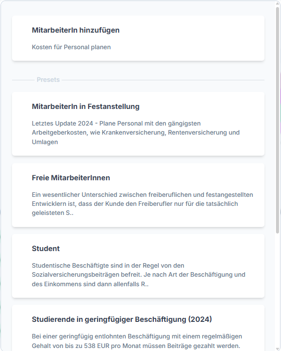 Du kannst im nächsten Schritt entweder direkt auf MitarbeiterInn "hinzufügen" klicken um fortzufahren, oder unter "Presets" eine unserer Vorlagen verwenden.