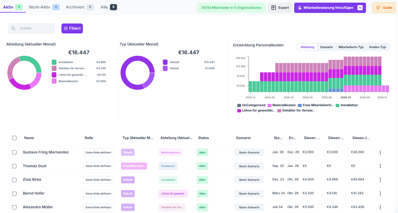 Du siehst deine Personalkosten für das aktuelle Monat aufgeschlüsselt nach verschiedenen Gesichtspunkten, von Abteilung, Typ bis hin zum Szenario.