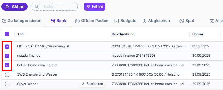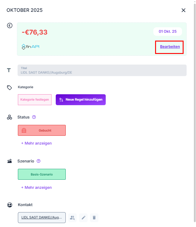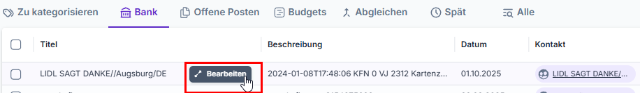 Indem du mit deiner Maus über die jeweilige Transaktion fährst, kannst du anschließend auf den Bearbeiten Button klicken.