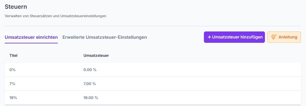Deine Steuersätze kannst du in finban über Einstellungen → Steuersätze anlegen.