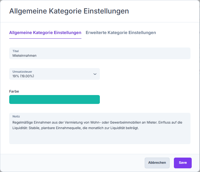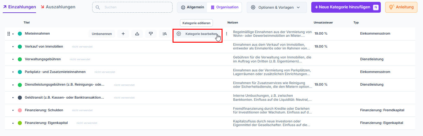 Wenn du mit deiner Maus über die jeweilige Zeile fährst, Kannst du die jeweilige Umsatzsteuer editieren, durch einen Klick auf Umsatzsteuer hinzufügen, kannst du weitere Steuersätze anlegen. Diese Steuersätze kannst du nutzen, um Kategorien bzw. auch einzelne Transaktionen Steuersätze zuzuordnen.