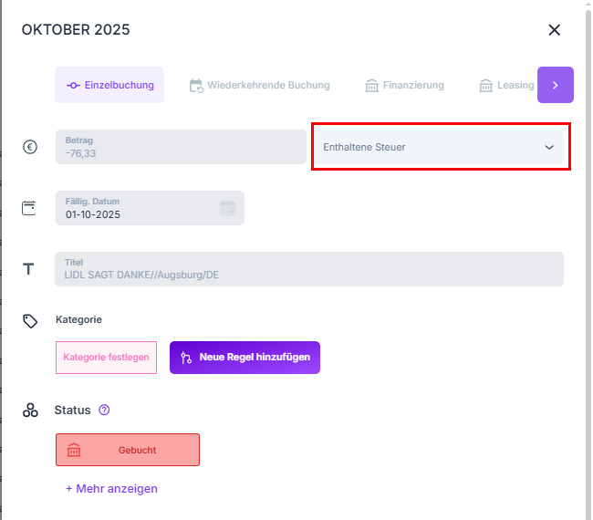 Im nachfolgenden Fenster kannst du auf das Drop-down-Feld Enthaltene Steuer klicken, um einen Steuersatz für die Transaktion zu hinterlegen.