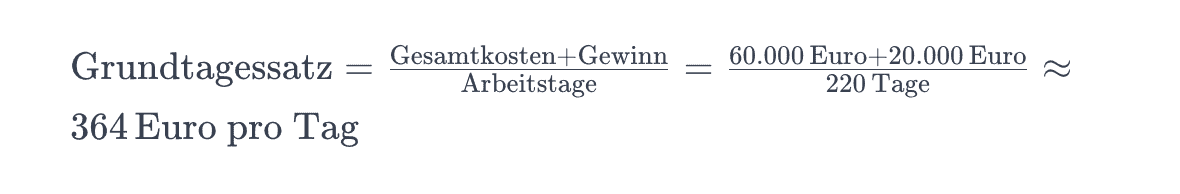 Let us assume your annual total costs are 60,000 euros and you want to achieve a profit of 20,000 euros. You have 220 available working days per year. Your base daily rate would be:
