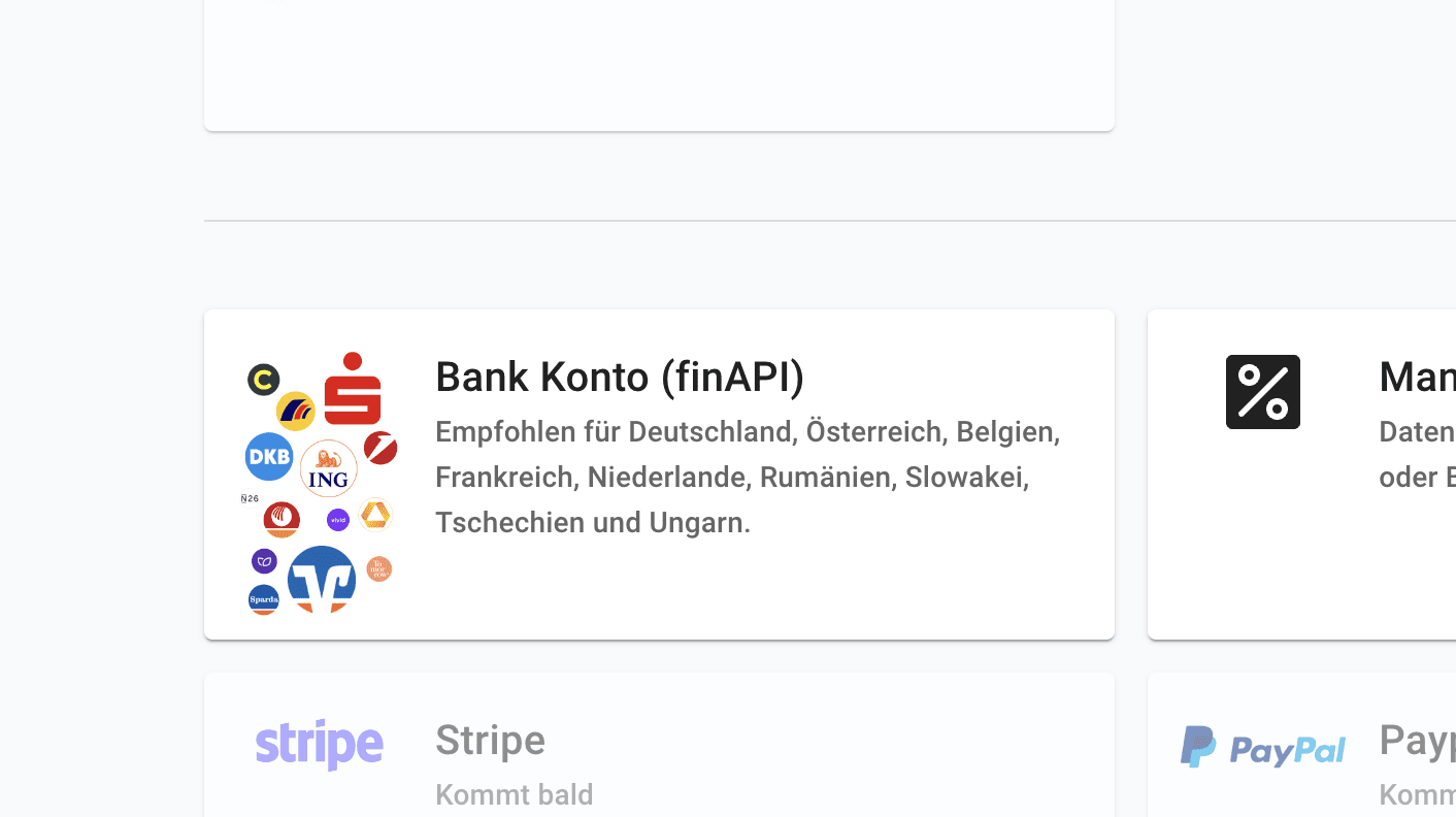 finAPI kann jetzt als weitere Open Banking Provider genutzt werden. Damit sind weitere österreichische Banken und Banken wie Qonto, finom und Revolut nutzbar.