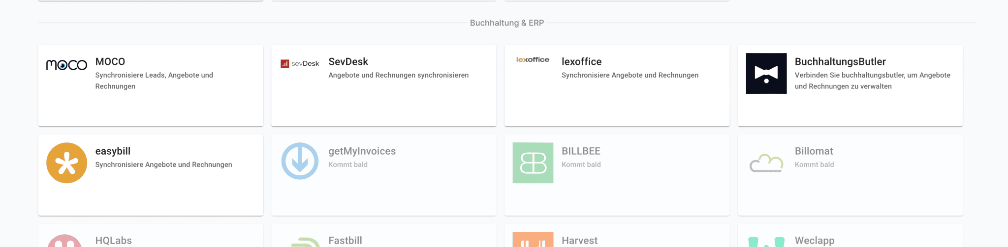 Weitere Integrationen: Buchhaltungsbutler & easybill