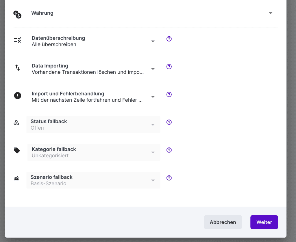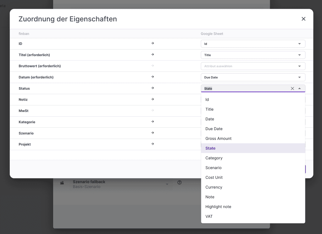 Wähle welche Google Sheet Spalte, mit welcher finban Eigenschaft gemappt werden soll. Der Header der Google-Tabelle wird verwendet, um die Zuordnung automatisch zu bestimmen. Du kannst diese aber auch manuell auch anpassen.