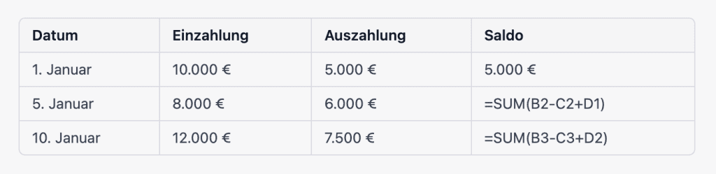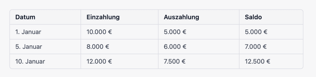 Die Tabelle enthält Spalten für das Datum, die Einzahlungen (Einzahlung), die Auszahlungen (Auszahlung) und das verbleibende Saldo am Ende jeder Periode (Saldo). Wie man sieht, enthält die Einzahlungsspalte alle Geldbeträge, die in das Unternehmen fließen, die Auszahlungsspalte alle Geldbeträge, die aus dem Unternehmen fließen, und die Saldospalte zeigt den verbleibenden Saldo am Ende jeder Periode.