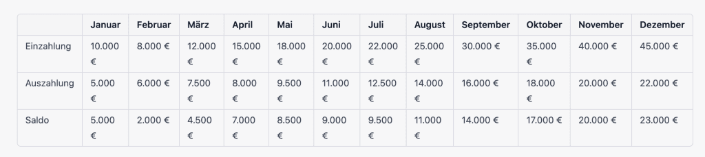In dieser Tabelle sind die Monate des aktuellen Jahres waagerecht über der Tabelle aufgeführt, mit den Spalten Einzahlung, Auszahlung und Saldo darunter. Jede Zeile zeigt die Einzahlungen, Auszahlungen und den Saldo für jeden Monat.